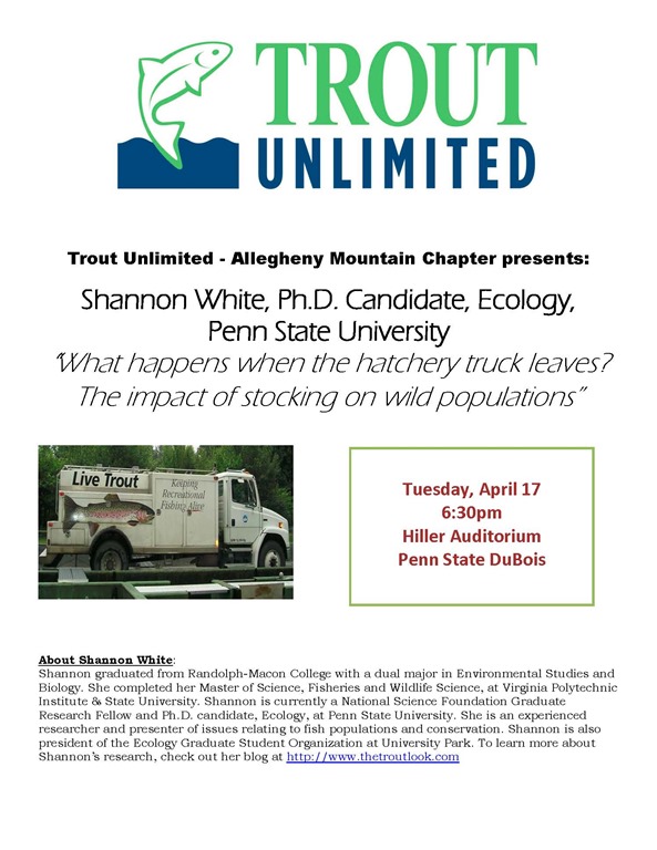 Mark your calendar for October17th membership meeting that will be at Penn State DuBois Rm 202. In addition to the election of officers and directors we will have Samantha Snedden speaking on her time at the Fly Fishing and Youth Camp and her experience at the PA Leadership Academy. If you have a child, grandchild or just know of a young person this is a must see. Applications will start in November so hearing what’s involved is important. Time is at 7pm and please bring a guest.